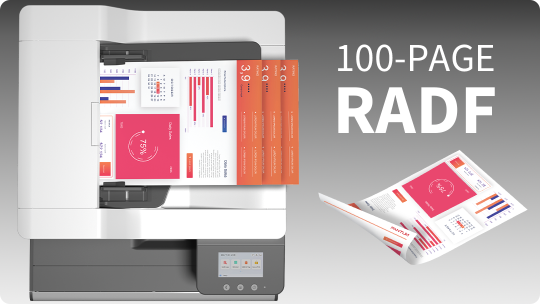 Стандартный 100-страничный реверсивный двусторонний автоподатчик (RADF) в моделях с ADF быстро сканирует обе стороны, оптимизируя обработку больших партий документов и повышая эффективность с минимальными простоями — идеальное решение для пользователей с большими объёмами печати и высокими требованиями к скорости и надёжности.